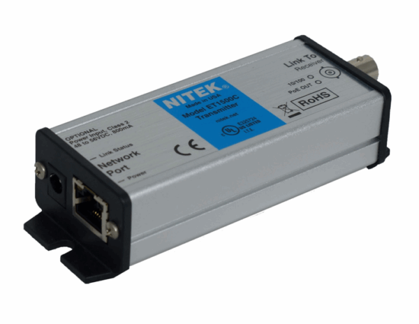 The System transmits IP cameras over coax and can quickly turn any ordinary RG59U coaxial cable into a high speed network communication & PoE path. When operating over RG59U coaxial cable, the coax network extender system can operate for distances of up to 500 meters (1,640 feet). ET1500C Transmitter is part of a system that operates in conjunction with either an ER1500C Single channel Receiver, ER8500C Eight Port Receiver, or ER16500C Sixteen Port Receiver.The ET1500C coax ethernet extender requires very little installation time & absolutely no set up or configuration. The ET1500C ethernet over coax network extender transmitter is transparent to the network and has no IP or MAC addressing. Simply connect your network devices to the network ports of the transmitter along with existing cabling and the system begins communicating. LED indicators show the status of network communication and PoE power.