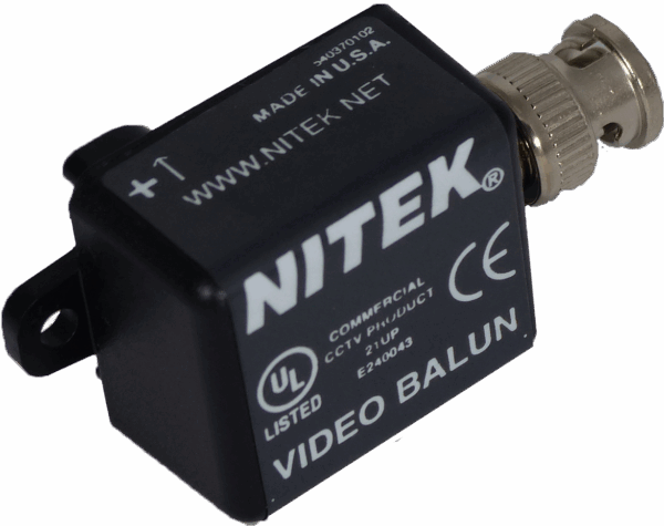 The VB37M is a “heavy duty’ design with two screw terminals for UTP connection and a female BNC for coax connection. This passive UTP video balun operates with other passive video baluns, transceivers or active receivers.The VB37 series is available in the M model (male BNC) and the F model (female BNC). The VB37M UTP transceiver provides a low cost means of sending live video over unshielded twisted pair, point-to-point wiring for distances of up to 750 feet (225 meters) with other CCTV balun transceivers, and up to 3,000 feet (900 meters) with the TR560 single channel receiver and model 56 Series hubs. The VB37M is compatible with all the “up-the-coax” control systems. A basic system uses (2) video balun transceivers, one at each end of a twisted pair of wires. These units are intended for use over existing in-house telephone wiring, Category 5 wiring or other twisted pair cable runs to provide a convenient, cost-effective alternative to coax. The VB37 series units are designed to provide superior immunity from noise and interference even when running next to line power.The VB37M alaso provides a convenient mounting tab for installation. The VB37M is a UTP transceiver that provides another Security Transmission Solution from Nitek.